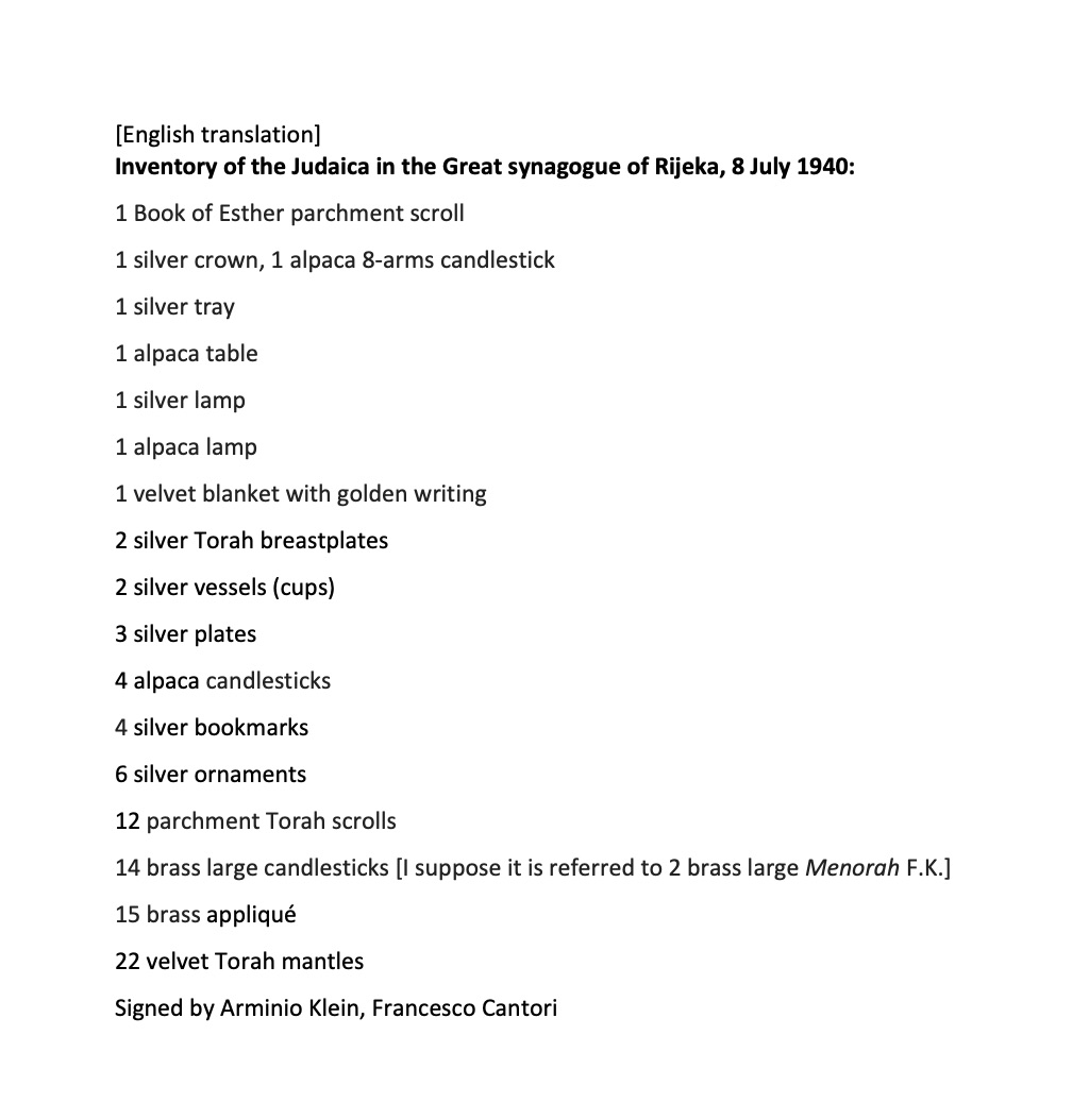 Klein was released after spending two weeks in prison, and on 8 July 1940 he compiled a list of the Judaica of the Great synagogue, that was also signed by the community's secretary Francesco Cantoni. According to Italian historian Silvia Bon, the list was made up in response to a request (soon halted by the Italian Ministry of Interior) by the chief rabbi of Palestine that all Judaica be sent to Jerusalem.