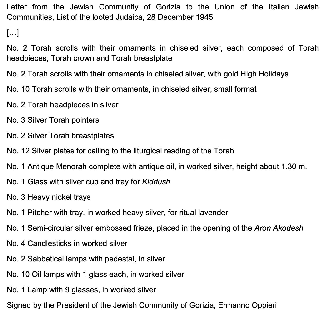 On 28 December 1945, Oppieri sent a list of the missing silver ceremonial objects to the Union of the Italian Jewish Communities.